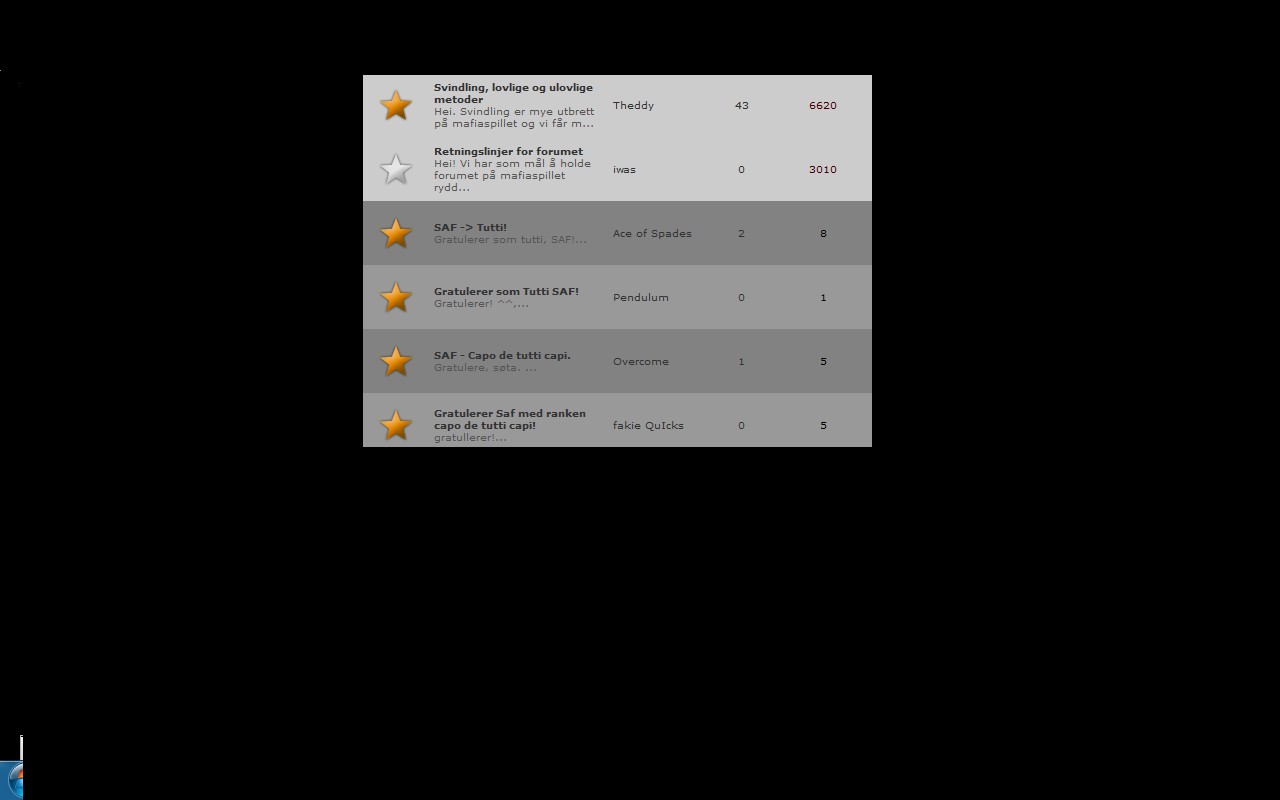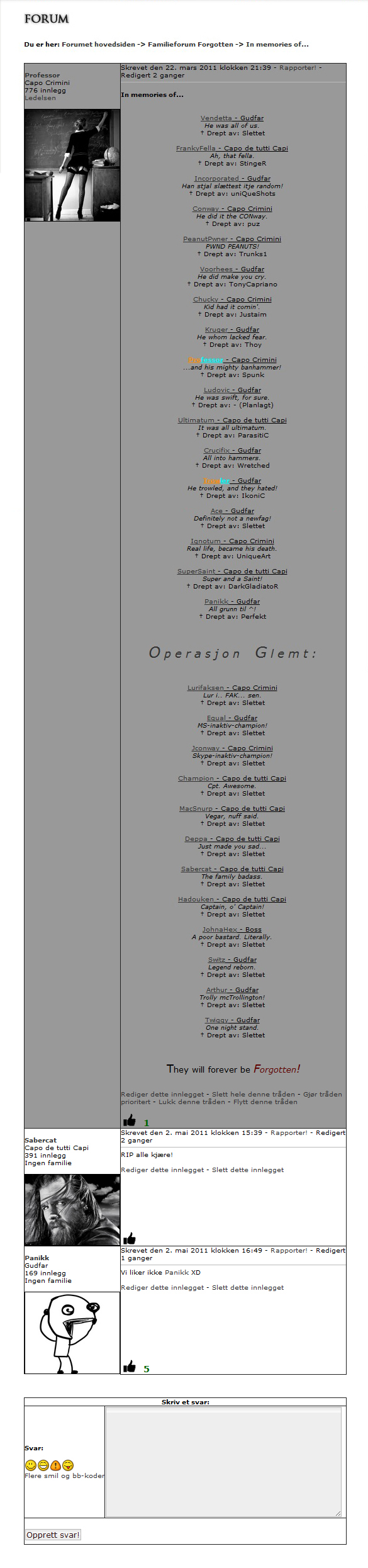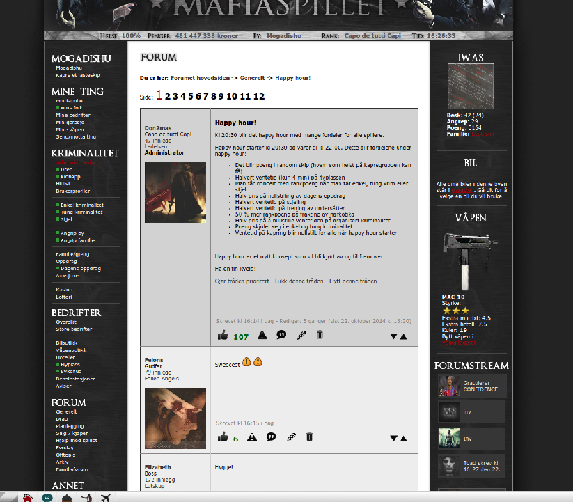 Vi har fylt inn litt bilder og sitater basert på hva vi har fanget opp i forumet, men vi håper at flere gamle spillere kommer innom i løpet av uken og sender oss deres bidrag. Har du noen gode minner fra årene som har gått, eller ønsker du at vi finner en gammel forumtråd eller noe interessant statistikk fra tidligere runder? Send oss en supportmelding i spillet, eller en e-post til support@mafiaspillet.no, så skal vi gjøre vårt beste.