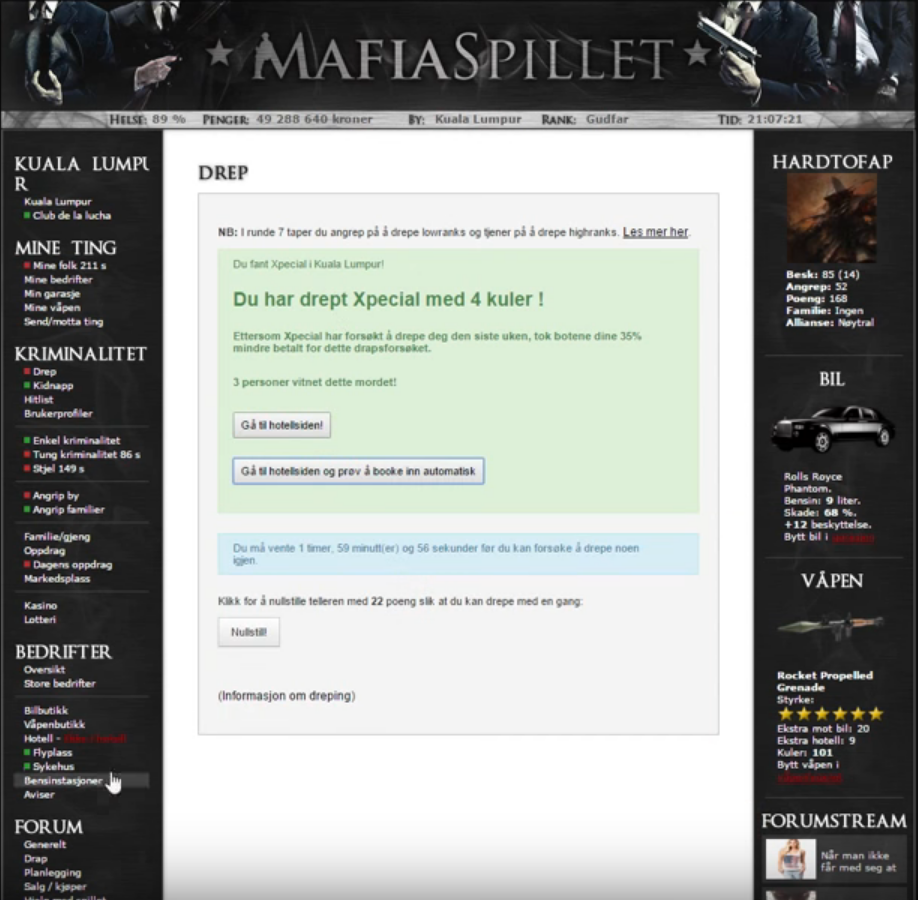 «Glemmer aldri når DonDark aka kjell nullet Offitec aka kodde (ekte noob på den tiden) ca 40 ganger konstant. Jørgen backfirer kjelli og dreper en gudfar som consig. Føste han gjør er å ringe meg på hustelefonen for å fortelle om at han drepte kjelli og ler seg i hjel. Når jeg sier han må ta bedrifter er jørgen så jævla rå at han ikke skjønner hvorfor ikke bedriftene kommer på "Mine bedrifter". Som altså gjorde at Jørgen gikk glipp av hotell, rute og våpenfabrikk <3»